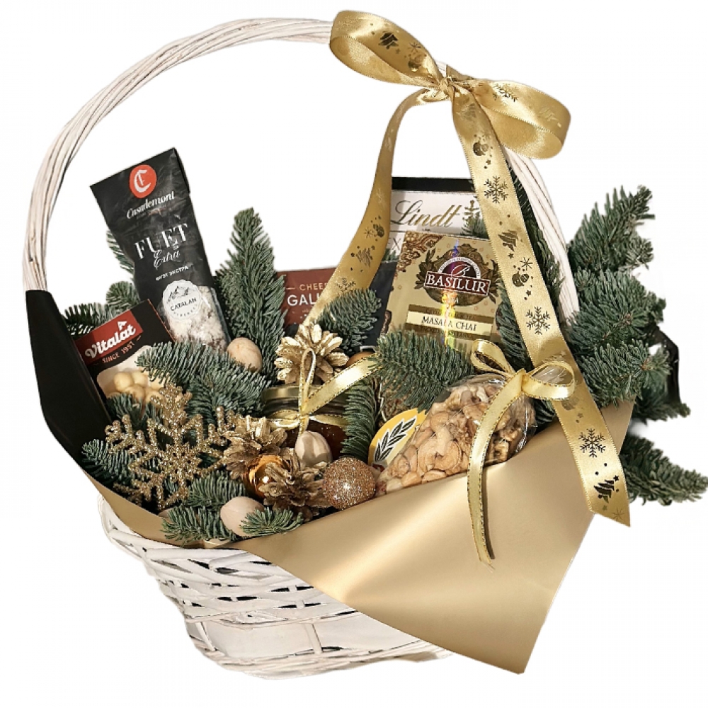 Состав новогодней корзины: Шоколад Lindt , черный чай Basilur или подобный, колбаса Испания, печенье (импорт), орехи двух видов