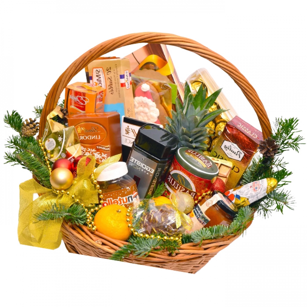 Состав подарочной корзины: кофе растворимый Egoiste Classic, шоколад Lindt или Schogetten (в ассортименте), крем-паста Nutella, ананас (свежий), апельсины, мандарины, банка натурального мёда, шоколадные конфеты Ferrero Rocher, печенье Walkers или Delicje, шоколадная фигурка «Санта», джем фруктовый (импорт), плитка шоколада с начинкой, праздничный декор: еловые ветви, золотистые шишки, шары, банты та гирлянды, плетёная корзина из натуральной лозы.