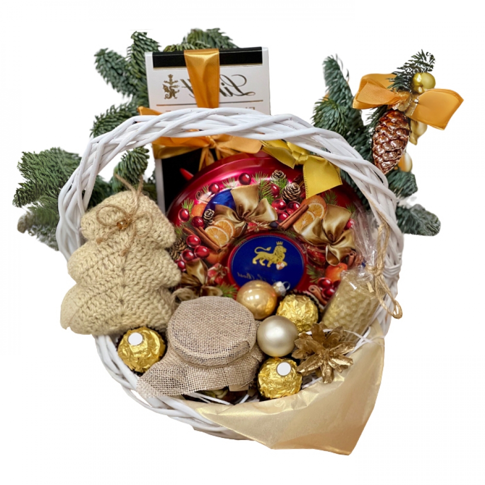 Состав подарочной корзины:ш околадные конфеты Ferrero Rocher, подарочная жестяная коробка с рождественским оформлением (ассорти конфет), шоколадная плитка elite или Lindt (в ассортименте), баночка натурального мёда в мешковине, декоративная свеча ручной работы из вощины, мини-мешочек с орешками и сухофруктами, еловые веточки, шишки, атласные ленты золотистого и янтарного оттенков, праздничные шары, белая плетёная корзина.
