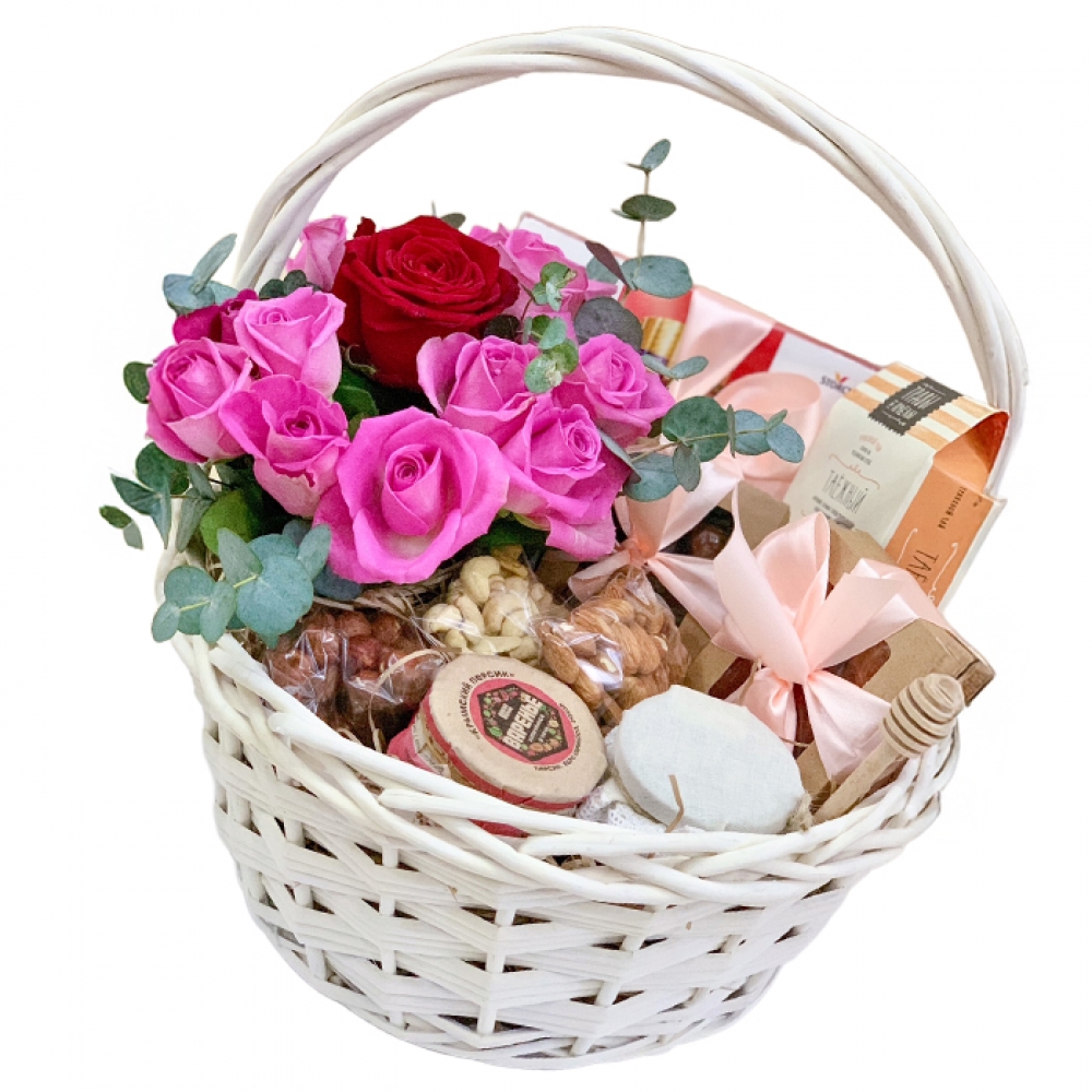Подарочная корзина с розами “Вкусный подарок” - это прежде всего знак внимания, который говорит о заботе, тепле и искренности. Оформите заказ уже сегодня - и мы доставим красоту и радость тем, кто вам дорог.